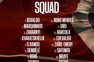 前锋:7-克瓦拉茨赫利亚、9-贡萨洛·拉莫斯、10-登贝莱、14-杜埃、29-巴尔科拉、49-姆巴耶